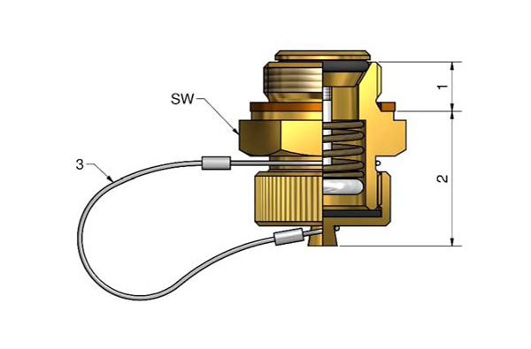 Thread M22x1.5 in brass. Supplied with stainless steel retention cable. The steel cable is attached to the body of the valve and the protection cap preventing misplacement and ensuring quick retrieval after service. |